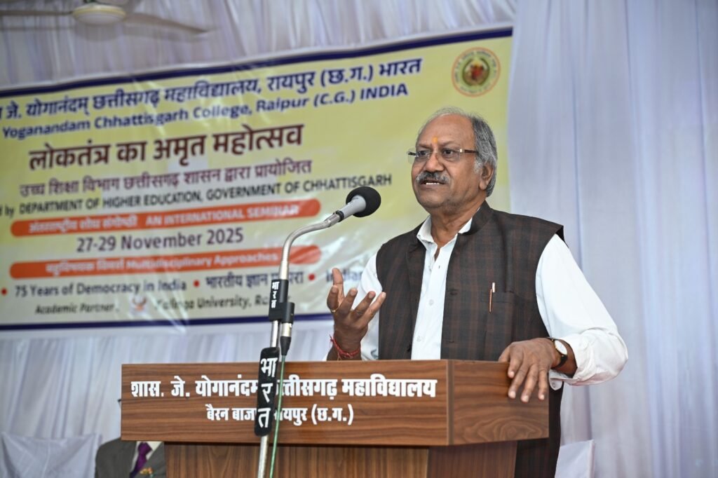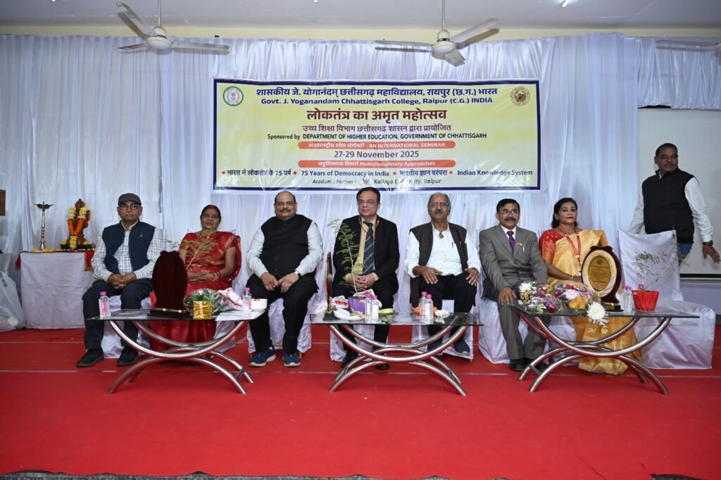 शासकीय जे योगानंदम छत्तीसगढ़ महाविद्यालय, रायपुर में आज “बहुविषयक विमर्शः भारत में लोकतंत्र के 75 वर्ष एवं भारतीय ज्ञान परंपरा” विषय पर तीन दिवसीय अंतरराष्ट्रीय सेमिनार का विधिवत शुभारंभ हुआ। महाविद्यालय प्राचार्य डॉ. तपेश चंद्र गुप्ता ने बताया कि कार्यक्रम का उद्घाटन मुख्य अतिथि माननीय श्री बृजमोहन अग्रवाल, सांसद रायपुर लोकसभा द्वारा किया गया। उद्योगपति श्री विजय गोयल एवं कलिंगा विश्वविद्यालय के कुलपति डॉ. आर. श्रीधर विशिष्ट अतिथि के रूप में उपस्थित रहे।