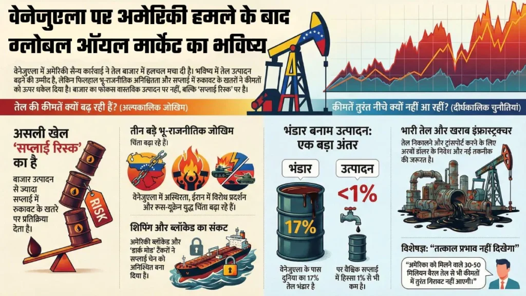 तेल के भंडार और सप्लाई का पूरा खेल समझने की कोशिश करते हैं वेनेजुएला पर अमेरिकी कार्रवाई ने तेल को एक साथ दो दिशाओं में धकेला है. अनिश्चितता बढ़ी है तो शॉर्ट टर्म में रिस्क प्रीमियम के चलते कीमतें थोड़ी ऊपर दिख रही है. दूसरी ओर भविष्य में ज्यादा सप्लाई की संभावना बनी है, ऐसे में कीमतें नीचे आने की संभावना रहेगी.
