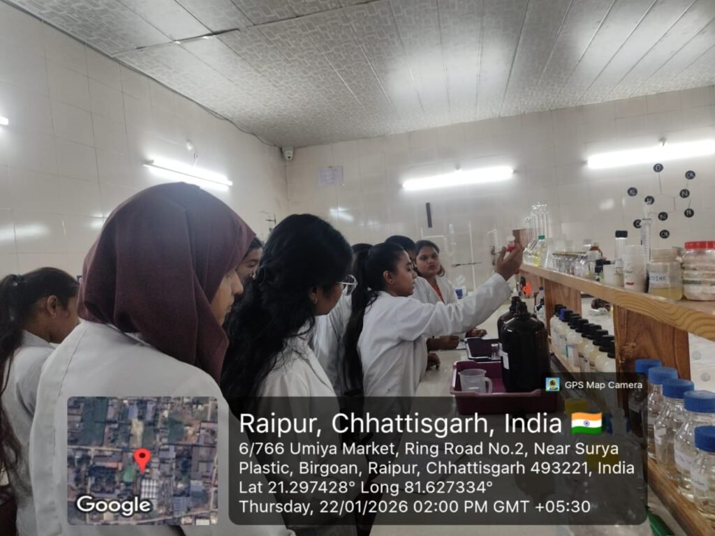रायपुर, 22 जनवरी 2026 शासकीय जे. योगानंदम छत्तीसगढ़ महाविद्यालय, रायपुर के रसायन शास्त्र विभाग के एम.एससी. चतुर्थ सेमेस्टर के विद्यार्थियों के लिए आयोजित पाँच दिवसीय इंटर्नशिप कार्यक्रम (19 से 23 जनवरी 2026) के चैथे दिन, विद्यार्थियों ने सिद्धाचलम प्रयोगशाला, बिरगांव, रायपुर में व्यावहारिक प्रशिक्षण प्राप्त किया। इस दिन विद्यार्थियों को उपकरणों की सहायता से रासायनिक परीक्षण तथा जल की गुणवत्ता जांच के बारे में विस्तार से जानकारी दी गई।