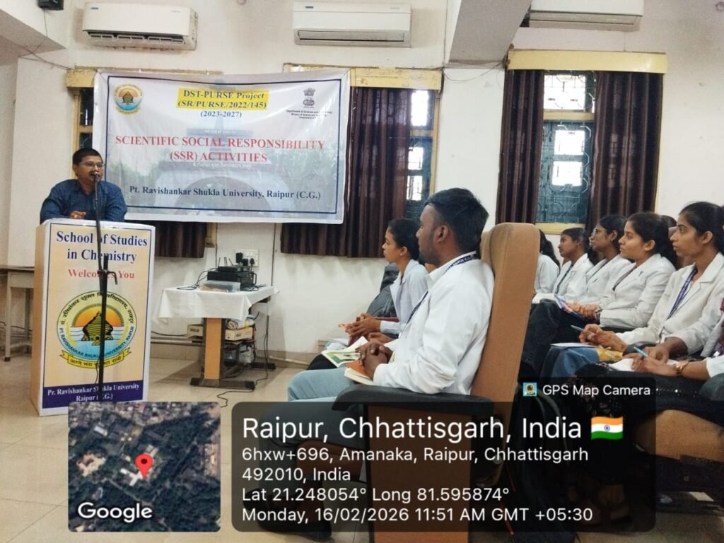 विभाग के प्राध्यापक डॉ. मनमोहन लाल सतनामी ने विभाग की नवीनतम शोध उपलब्धियों, प्रचलित परियोजनाओं और डीएसटी-पर्स परियोजना के अंतर्गत स्थापित अत्याधुनिक उपकरणों की जानकारी दी। उन्होंने कहा कि उन्नत अनुसंधान के लिए मूलभूत अवधारणाओं की स्पष्ट समझ और उपकरणों का व्यावहारिक ज्ञान अत्यंत आवश्यक है। डॉ. सतनामी ने विद्यार्थियों को नैनो-विज्ञान के अनुप्रयोगों, स्वर्ण नैनोकणों के संश्लेषण, उनके रंग परिवर्तन और अभिक्रिया गतिकी का प्रत्यक्ष प्रदर्शन दिखाया। उन्होंने समझाया कि नैनो-विज्ञान चिकित्सा, पर्यावरण एवं उद्योग क्षेत्रों में तेजी से उभरता हुआ क्षेत्र है।