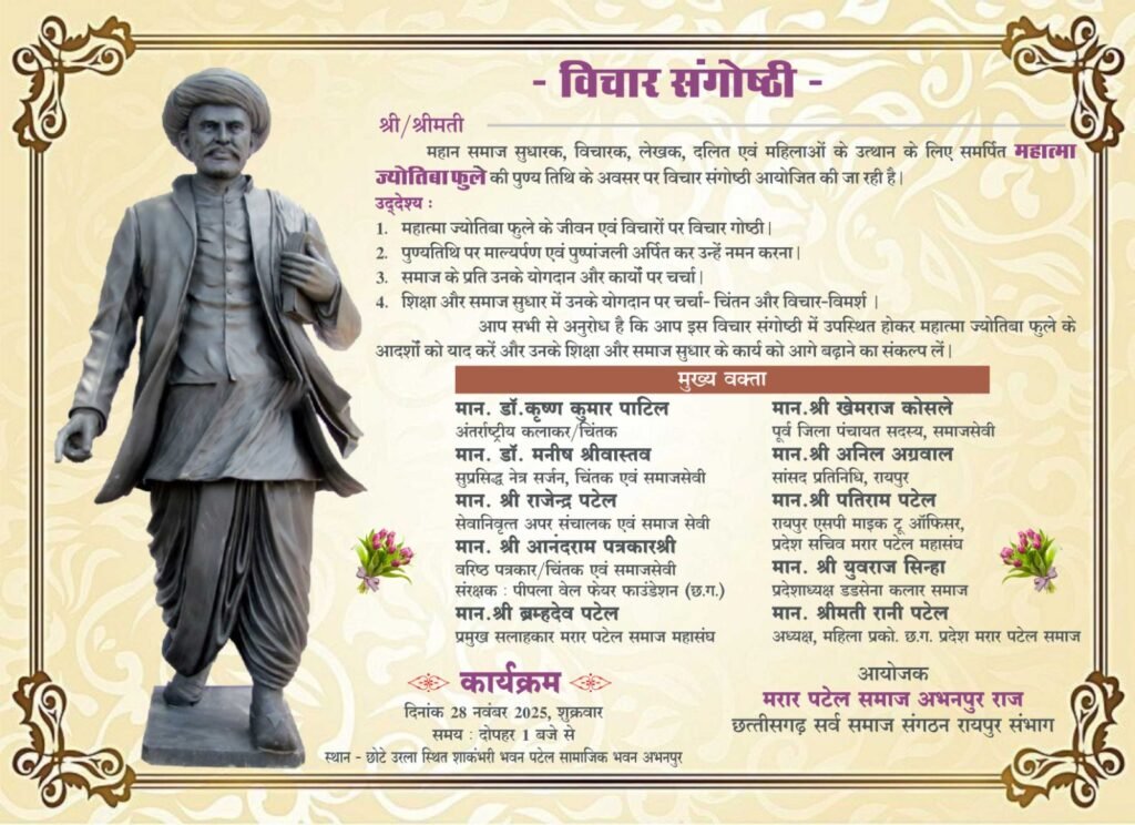 पुण्यतिथि पर संगोष्ठी आयोजित,जीवनी को पाठ्यक्रम में शामिल करने की उठी मांग अभनपुर । मरार पटेल समाज अभनपुर राज एवं छत्तीसगढ़ सर्व समाज संगठन रायपुर संभाग के संयुक्त तत्वावधान में शुक्रवार को अभनपुर स्थित शाकंभरी भवन में महात्मा ज्योतिबा फुले की पुण्यतिथि पर एक गरिमामय संगोष्ठी आयोजित की गई। कार्यक्रम में विभिन्न क्षेत्रों के विद्वानों, चिंतकों और विशिष्ट वक्ताओं ने भाग लेकर महात्मा फुले के जीवन, संघर्ष और विचारों पर विस्तार से प्रकाश डाला।