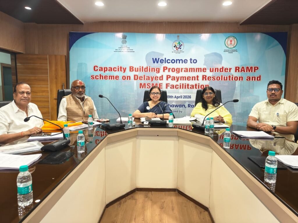 रायपुर। छत्तीसगढ़ शासन के वाणिज्य एवं उद्योग विभाग द्वारा भारत सरकार की RAMP योजना के तहत “विलंबित भुगतान समाधान एवं MSME सुगमिकीकरण” विषय पर दो दिवसीय क्षमता निर्माण कार्यक्रम 18 और 19 अप्रैल को उद्योग भवन, रायपुर में सफलतापूर्वक आयोजित किया गया।